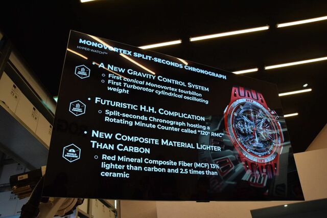 福留 最近は1億超のモデルがちょくちょく出てきて、時計界スゴいな、と思ってるんですが、ランボルギーニが複数買えるって、とんでもない話です。ほんと、どゆこと!?ですね。僕は個人的に『モノボルテックス スプリットセコンド クロノグラフ』が印象に残ってるんです。まず赤が目に入ってきました。これはロジェ・デュブイが独自開発したハイパーテックMCF(ミネラル複合繊維)という素材なんですが、カーボンよりも13%、セラミックより60%も軽くて丈夫なのだそうです。でも赤を発色させるのが難しく、今回やっとできた、ということでした。