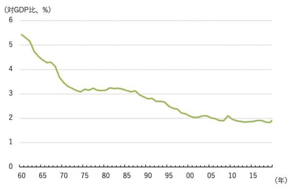 北大西洋条約機構(NATO)各国は2014年、2024年までに加盟国の防衛費を名目GDPの2%の規模まで引き上げることで合意に達したが、フランスの防衛費は2000年代から名目GDPの2%程度で推移していた。防衛費がGDPの3%半ばとなるのは、冷戦の真っ只中の1970年代半ば以来のことだ(図表2)。