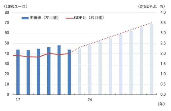 その結果、名目GDP(国内総生産)に占める防衛費の規模は2030年時点で3%台半ばまで膨らむ見通しだ。