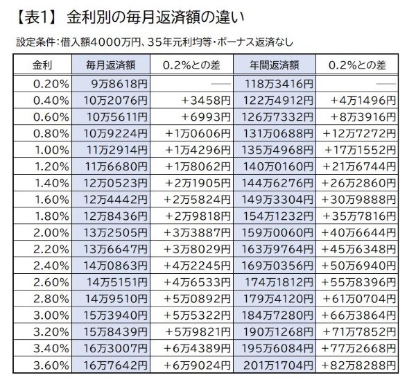 たとえば、変動金利型に多い0.4%だと、借入額4000万円、35年元利均等・ボーナス返済なしの毎月返済額は10万円強だが、固定金利型に多い1.6%だと12万円以上になり、同じ借入額でも月額2万円以上もの差があるのだ。