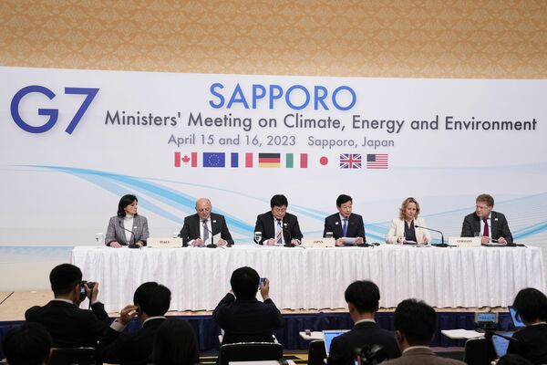 札幌で開かれたG7気候・エネルギー・環境大臣会合の記者会見。日本からは西村康稔・経済産業大臣が出席した(写真:AP/アフロ)