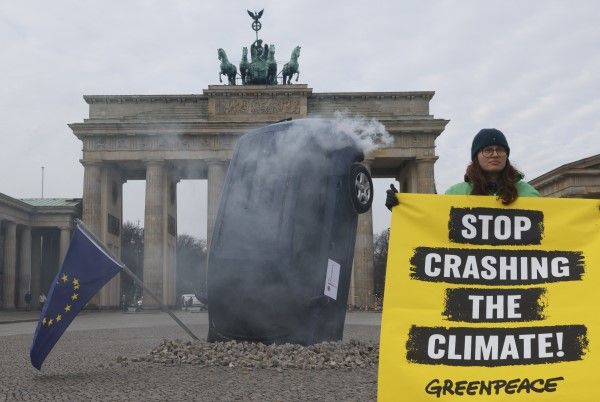 ベルリンの名所ブランデンブルク門の前で、欧州連合(EU)が目指す内燃機関搭載の自動車規制に反対するドイツに抗議し、環境保護団体グリーンピースが地面にめり込んだSUVを設置した(写真:ロイター/アフロ)