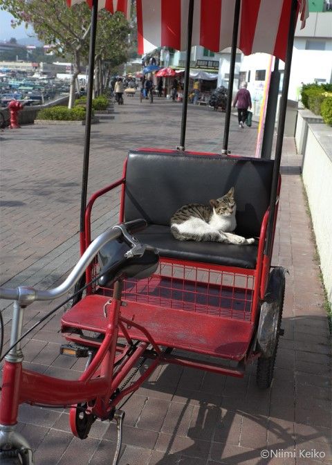 通行できる自動車は、救急車、消防車、ゴミ収集車などだけです。自転車のタクシーはありますが、平日の利用客はほどんどいないので、猫のお昼寝場所になっていました。