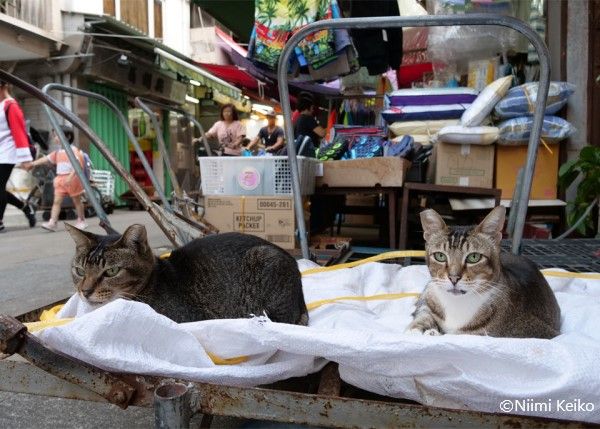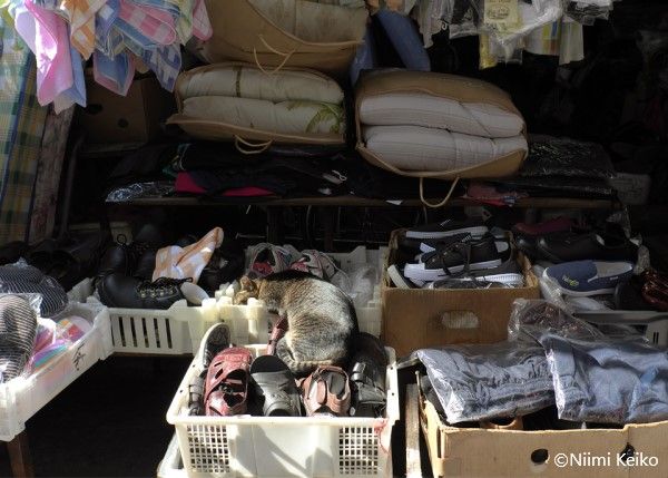 フェリーターミナルに近いこの店は、靴や袋物、寝具も売っている衣料品店です。ひもでつながれている2匹の猫。この猫たちには見覚えがありました。