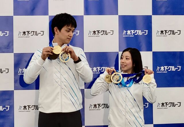 4月25日、フィギュアスケート・ペアの三浦璃来・木原龍一の「報告会」が開催された。2人が所属する木下グループが実施したものだ。