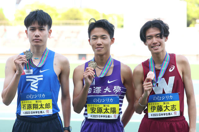 2023年4月23日、日本学生陸上個人選手権、男子 5000m表彰式、駒大の安原太陽(中央)、東海大の石原翔太郎(左)、早大の伊藤大志 写真=長田洋平/アフロスポーツ