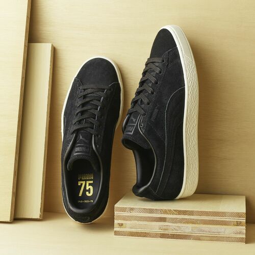 そんな名作の随所に、ブランド誕生75周年を記念したディテールが落とし込まれたアニバーサリーモデルがこちら。上質なスウェード素材のアッパーは、サイドにあしらわれたフォームストライプからステッチまで、その全てをブラックで統一。豊かな表情と大人の落ち着きが同居した佇まいに。左右のヒールタブにそれぞれプーマキャットと75のマークを配し、インソール部分に刻まれた“PUMA 75”の文字がさりげなく存在感を主張している。