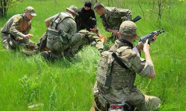 昨年5月からウクライナ軍に従軍し、米陸軍仕込みの戦闘外傷救護を指導している元米陸軍兵士マーク・ロペス(ウクライナ軍少佐)と、戦前は裁判所に勤めていたとはとても思えない屈強なユーリーが教官だ。ロペスが戦場での点滴や気管切開、胸に針を刺して肺と胸壁の間に溜まった空気を抜く胸腔穿刺の説明を始めると、若者の1人が暑さで倒れ込んだ。