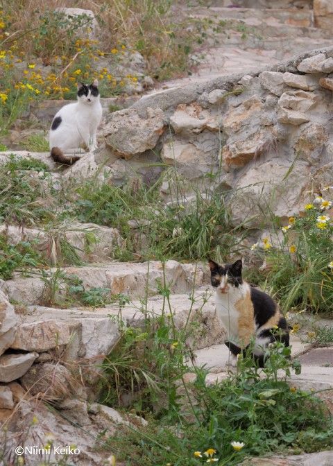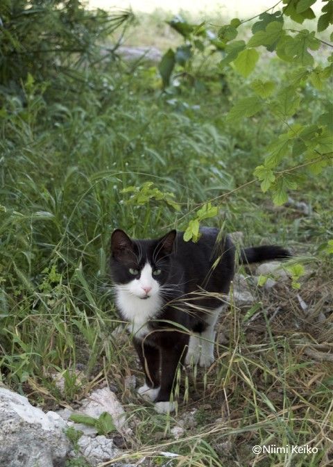 階段を上った先は原っぱで、低い木の影で休んでいた猫が振り向きました。広く平らな場所なので、以前は大きな屋敷があったのかもしれません。