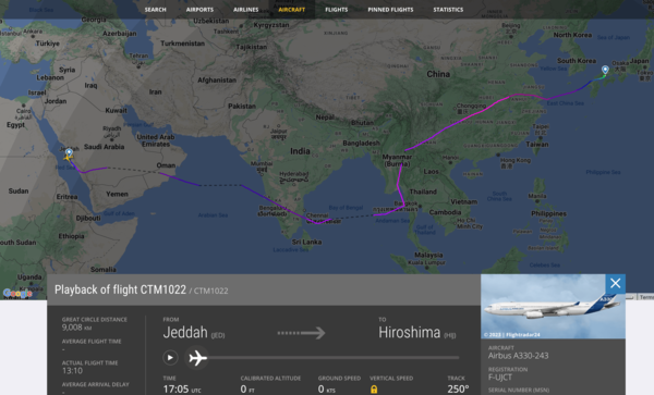 広島空港に飛来したG7各国の政府専用機にも、このADS-Bを使っていたものがあったようである。そのためゼレンスキー大統領が乗ったフランス政府専用機もフライトレーダー24によって、下記の写真のようにサウジアラビアからインド南部、ミャンマー、そして中国本土の上空を飛行して広島空港に到着する約13時間のフライト情報が話題になったのである。
