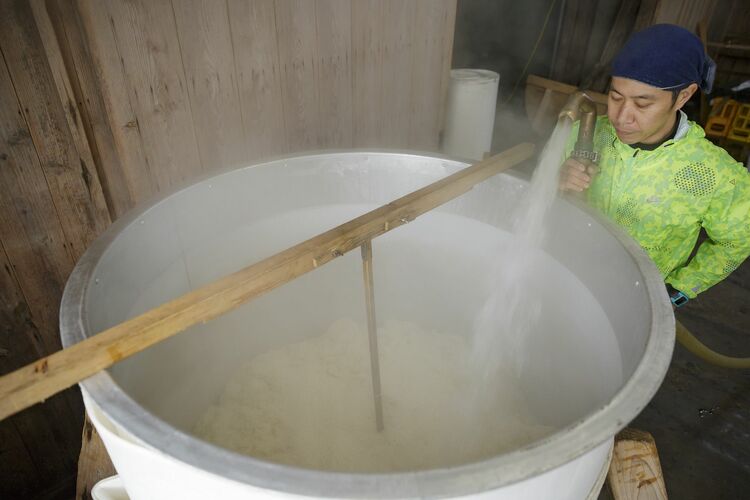 「高温山廃酛とは、その名の通り、55℃の高温で仕込む酒母(山廃酛)の製造方法です。最初に蒸し米と米麹、温度を調整した水を入れて、全体を混ぜたときに55℃になるようにします。この温度で、タンク内のほとんどの雑菌が死滅します」