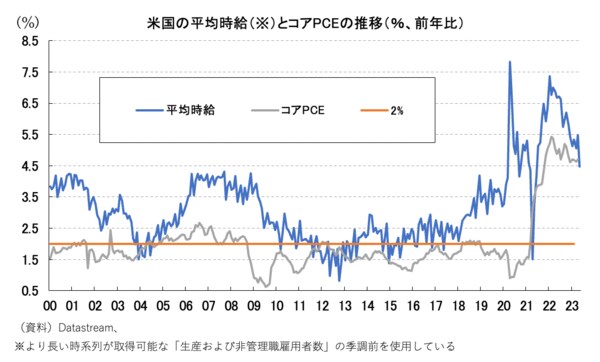 図表①に示されるように、賃金とコアPCE(個人消費支出)がそろってピークアウトし始めているのは確かであり、ここに利上げ停止を議論する余地があることは理解できる。だが、ともに前年比4%台後半で推移しており、目標である2%まではかなり距離がある。