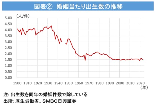 家庭当たりの子どもの人数の参考指標として、婚姻当たり出生数を試算すると、1973年は1.95人であったが、2022年には1.53人へ減った(図表②)。約50年間で8割弱(78%)の縮小だ。