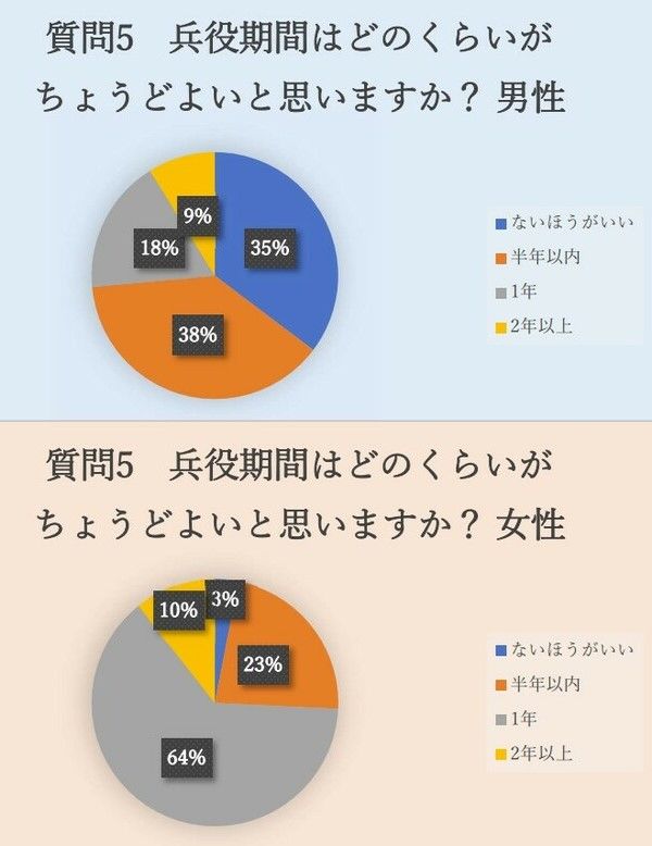 そして、兵役期間はどのくらいがちょうどよいかという質問に、「1年」と答えた割合が女性は約64%、男性は約18%と大きな差があり、一方で、兵役は「ない方がいい」あるいは「半年以内」とする女性が約26%、男性は約73%と逆転する。