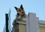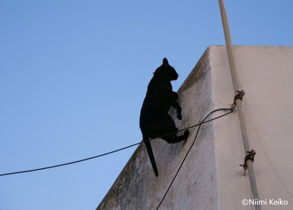 あっという間に太陽が沈みました。それを追いかけるように、黒猫が塀を駆け上ります。この黒猫を見たとたん、三毛猫は姿を消してしまいました。相性のわるい猫だったのでしょうか。
