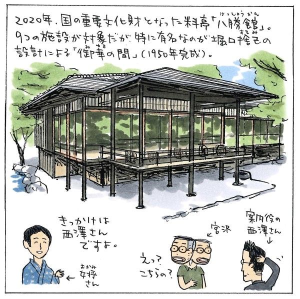 八勝館は名古屋市内にある料亭。食通で知られる陶芸家の北大路魯山人(ろさんじん)も認めた味と空間。2020年には、建築家の堀口捨己(すてみ)が設計した「御幸(みゆき)の間」(1950年完成)など、敷地内の9つの施設が国の重要文化財となった。