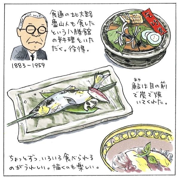 イラストを自己解説すると、この絵は鮎の串焼きがうまく書けた。四角い陶器の器も焼き物感がいい感じだ。