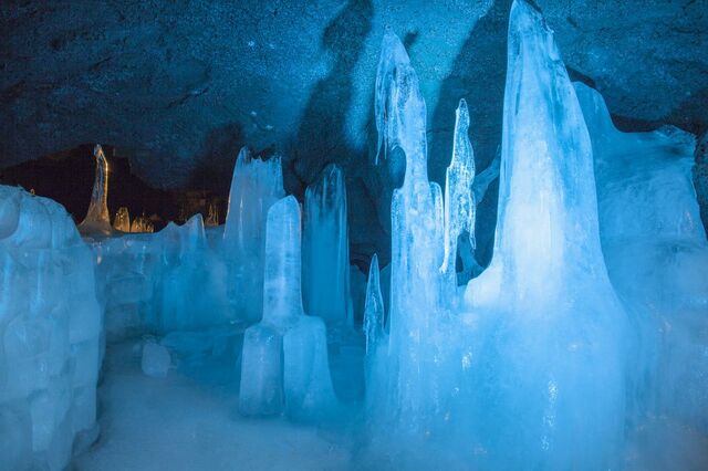 天井からしみ出した水滴が凍ってできた美しい氷柱は、必見です。