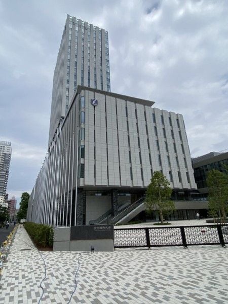 サンシャイン60側から見ると、道路に面してシルバーの鉄柱が約100本並ぶ。現代アート?と思ったら、留学生の母国の国旗(約100か国)をすべて掲げるのだという。それは壮観。