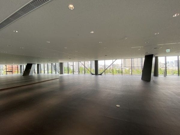 ガーデンウイング(低層棟)のフィットネススタジオやジムもこんなに充実。これらの部屋はV字の柱で支持されており、大半が片持ち構造で地上から浮いている。
