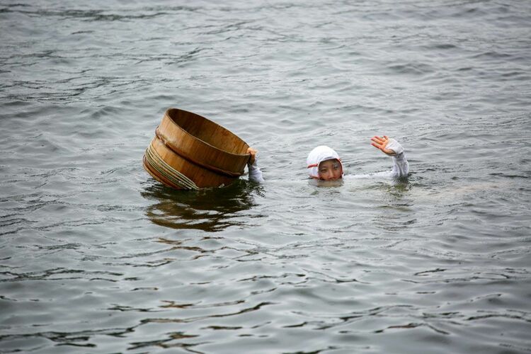 また、かつて海女さんは海底に潜ってアコヤ貝を採取し、核入れした貝を再び海底へ戻したり、赤潮や台風の際には、いち早く安全な場所に貝を移したりなど、真珠の養殖にとってなくてはならない存在でした。その海女さんの潜水作業の実演もあります。