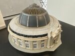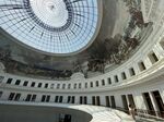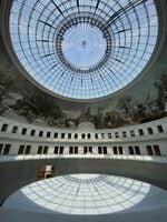 吹き抜け上部のフレスコ画やしっくい装飾は手作業で修復。鉄部分は長年の使用で塗り替えられていたものを、オリジナルのブルーグレーに戻した