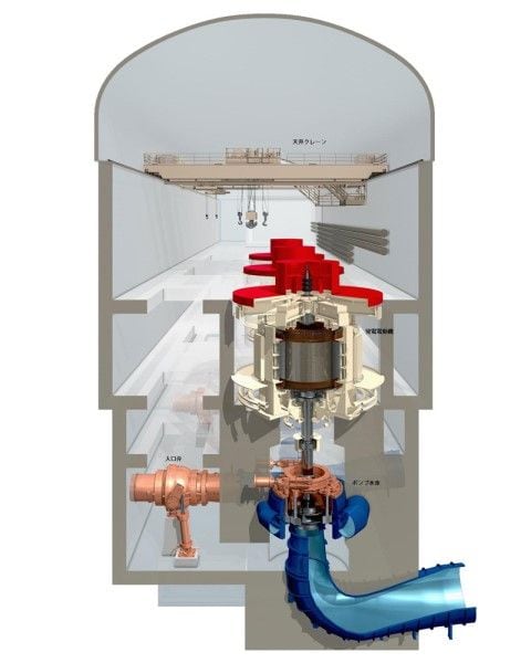 一方、余剰電力による揚水時はこの逆となる(下部調整池から上部調整池に汲み上げ、位置エネルギーを蓄える)。