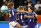 コスタリカ戦、先制ゴールを決めた猶本に駆け寄り祝福する選手たち(写真:ロイター/アフロ)