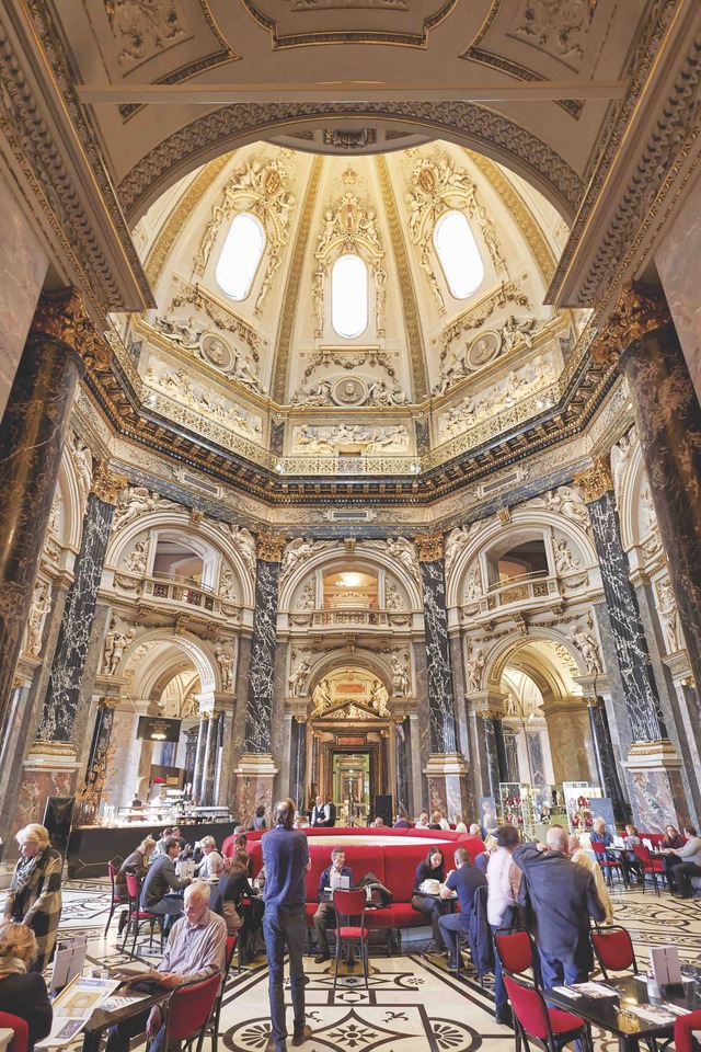 ドーム内は教会のような荘厳さと、贅を尽くした装飾のきらびやかさで、訪れる人を圧倒する。しかし、蝶ネクタイをつけた、スマートな立ち振る舞いの給仕に威圧感はみじんもなく、珈琲を気軽に楽しめる。ここはウィーンであるからして、たった一杯で新聞を読みながら長居してもかまわない。
