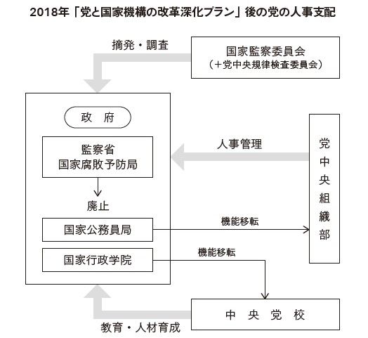2018年3月、二柄論を組織の形に落とし込む改革が実施された。「党と国家機構の改革深化プラン」のなかの人事に関する組織改革だ(次の図)。これにより、「則ち群臣、其の威を畏れて其の利に帰せん」との言葉が具現化された。政府の官僚が党と習氏に忠誠を誓い、習氏のために身を粉にして働く仕組みだ。