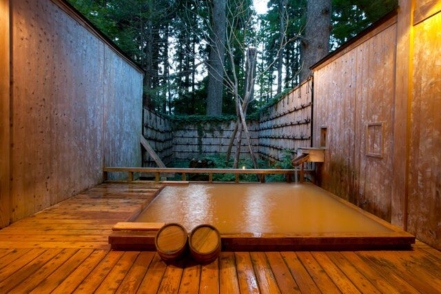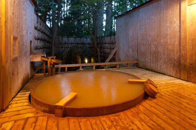 檜造りの貸し切り露天風呂で強塩泉のにごり湯を満喫