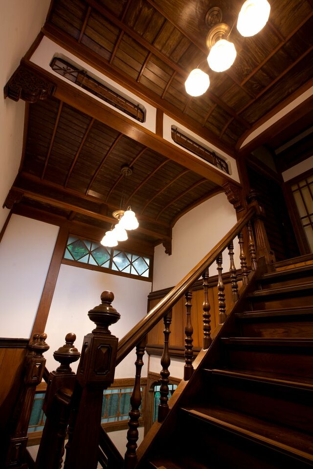 階段室。鹿鳴館風の意匠で擬洋風の技法が見所