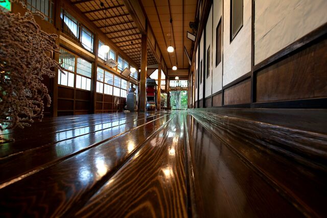 磨き抜かれ飴色に光る一枚通しの天然秋田杉を使った廊下