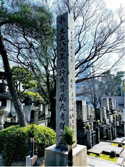 「大正八九年流行感冒病死者群霊」と刻まれた慰霊碑である。これは墓地の入り口にあり、ひと際大きな奥津城(神式の墓所)だったので目に留まったのだ。