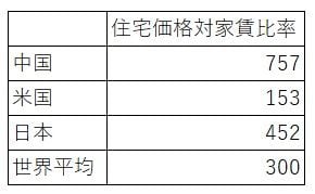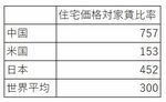 例えば2000万円で購入した家を月額家賃10万円で貸し出したとすると、家賃収入が購入金額を上回るのが200カ月で、住宅価格対家賃比率は200となる。ところが、次の表に示すように、中国はこの比率(回収できるまでの月数)が非常に高い。