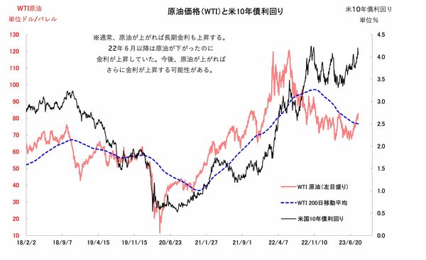 今年7月に入って以降、原油価格が大幅に上昇し、足元では1バレル=80ドル台前半で推移しています(図1)。200日移動平均線を上回ったのは2022年8月末以来、約2年ぶりのことです。