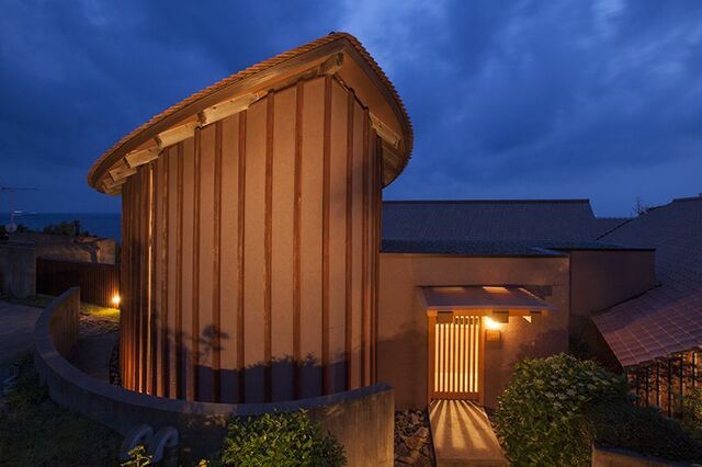 円柱に船を載せたようなインパクトのある建物は、フロントとサロンになっている。設計を担当した建築家の竹原義二氏さんは「和船がそのまま海へ向かって降りていくようなイメージを表現したかった」という。個性的な建築は「グッドデザイン賞」をはじめ、多くの賞を受賞している。