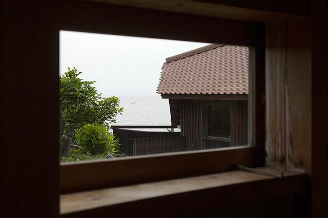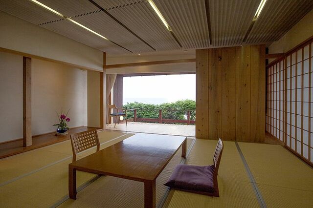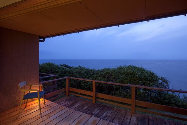サロンから中庭に沿って回廊を進んで行くと、瓦屋根を付けた長屋の宿泊棟があり、趣の異なる客室6室が連なる。全室とも窓が大きくとられ、座椅子に座った目線の先に、水平線の海と空が広がる。ガラス戸を開け放すとテラスがあり、見渡す限りの大海原が潮騒のBGMとともに出迎える。とくに夕暮れ時は、海も空も茜色に染まりドラマチックだ。