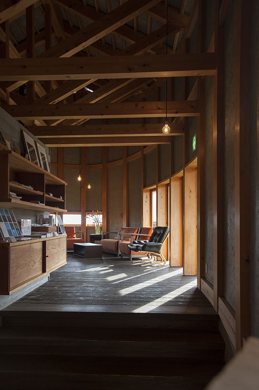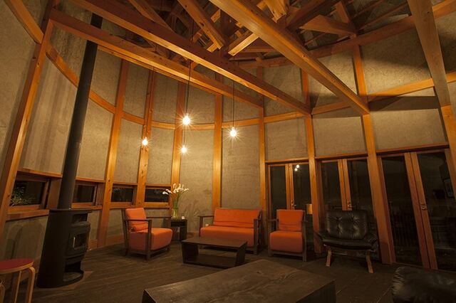 サロンの天井は、和船をひっくり返したようなデザインになっている。梁が幾重にも架かり、宮大工が紀州の木材で組み上げた。内壁は珪藻土と藁を組み合わせた土壁仕上げで落ち着いた印象だ。モダンなチェアを配する居心地のいい空間で、滞在中はもう一つの客室のようにゆっくり過ごせる。