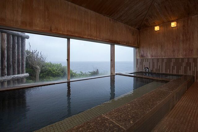 男女別の大浴場は敷地の奥、断崖の地に造られ、まるで海に浸かっているような気持ちで入浴できる。とろりとした質感のある温泉は、pH9.9を示す高アルカリ性の単純硫黄泉。美肌の湯と評判で、湯上りは肌がツルツルになる。源泉そのままの冷泉の湯船と加温した温泉の湯船を用意。ぬる湯と熱湯を交互に入浴すれば、血行がよくなり代謝が高まる。