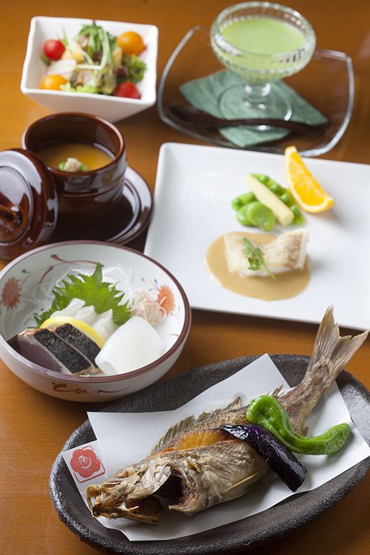 食事は夕食・朝食とも客室でゆっくり味わえる。夕食は例えば、イサキの唐揚げ、白身魚のソテー、冷製スープをはじめ、土地の味覚を盛り込んだ彩り豊かな季節の料理。オーナーの伊谷秀夫さんが、近海の幸や地元の野菜を使って丁寧に調理し提供する。