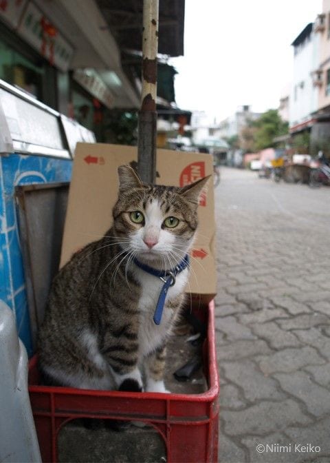 こちらの猫は、近所の犬が店の前でたむろしないように見張っています。店から冷房の冷気が流れてくるので、犬たちが集まってきてしまうのです。