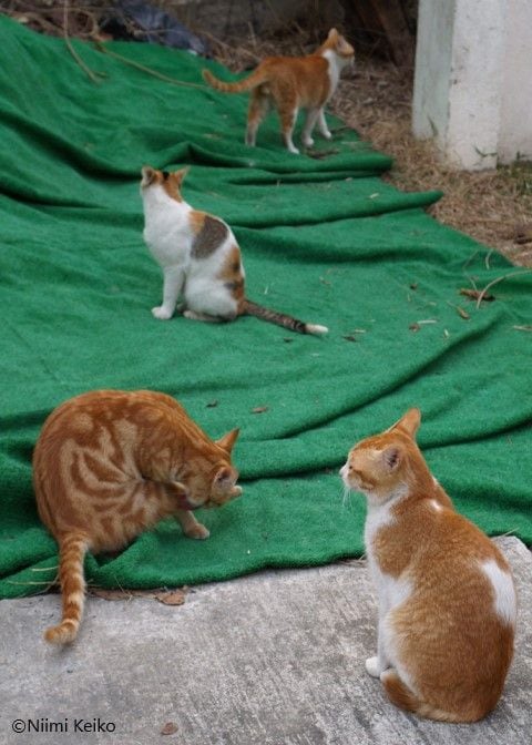集合住宅の中庭で猫たちが集まっていました。これから猫の集会がはじまるのでしょうか。あたりが暗くなるにつれ、さらに猫がふえましたが、近寄ったりせずに互いに距離を保っている集団でした。