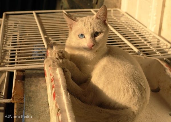 西から夕陽が照りつけると夕凪が終わり、やさしく海風が吹いてきます。顔を埋めて寝ていた白くんが頭を起こしたので近づくと、きれいなオッドアイで、思わず引き込まれました。