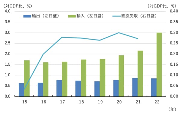他方で、イタリアの中国からの輸入は同1.8%から同3.0%に急増した。それでは直接投資(FDI)はどうかというと、累計受入額は2019年から2021年までの間に名目GDPの0.26%から0.27%と、ほとんどど増えていない。