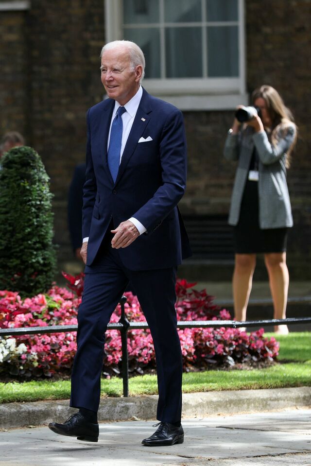 2023年7月10日、イギリス・ロンドンのダウニング街10番地に到着したジョー・バイデン米大統領。この後、首相官邸でリシ・スナク首相との会談に臨んだ。アメリカが7月7日に決めたウクライナへのクラスター弾の供与について説明した模様。アメリカとの立場の違いをにじませる英国に理解を求める狙いがあった。
