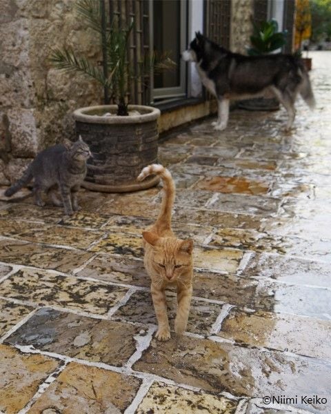 すると、通り雨があり、石畳があっという間に濡れてしまいました。でも通り雨には猫たちも慣れている様子で、雨雲が通り過ぎると足元を気にしながら猫たちが路地に出てきました。