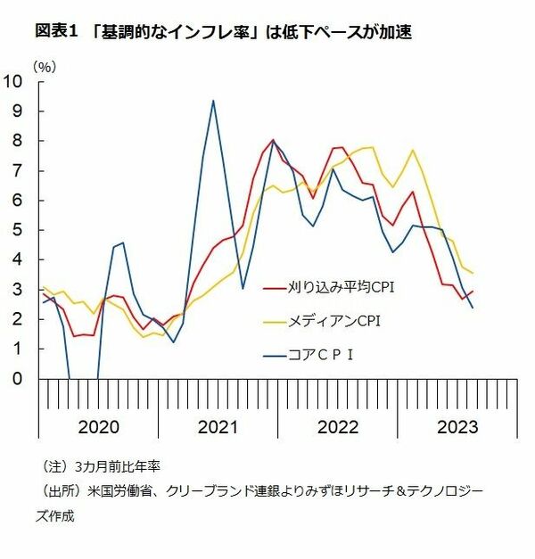 小野亮氏(以下、小野):刈り込み平均値(※)やメディアン(中央値)などの「基調的なインフレ率」の指標は低下ペースが加速しており、2~3%台半ばです。8月のコアCPIも4.3%に下がりました(図表1)。引き締め効果がようやく出てきたというところだと思います。