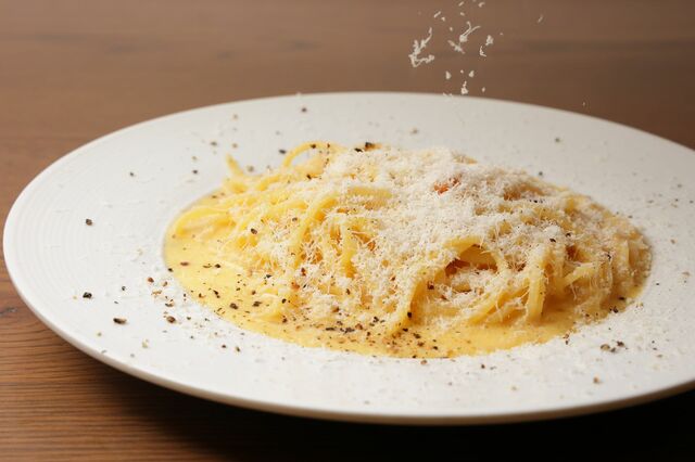 『ローマ風カルボナーラ』 1700円。仕上げにペコリーノチーズをたっぷりふりかけて