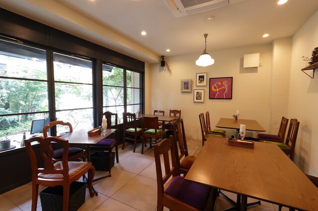 大きな窓を豊かな緑が縁取る気持ちのいい空間
